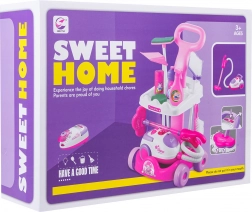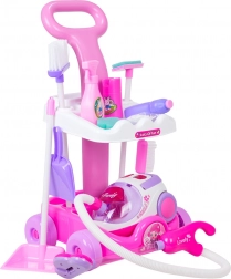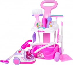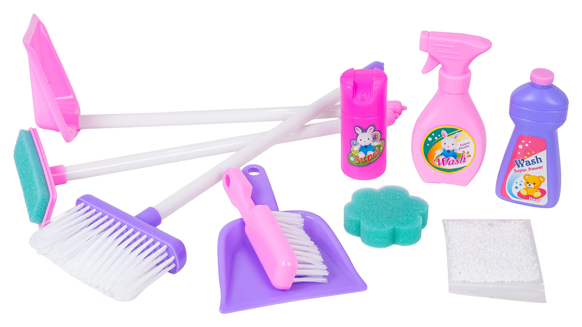 Il set offre un’attrezzatura completa: spazzola lunga, paletta, spazzolino, tergivetro per finestre, spugna, finte confezioni di detergenti e palline di polistirolo per l’aspirapolvere. Grazie alla disposizione intelligente su due ripiani, tutto è riposto in modo ordinato e facilmente trasportabile.