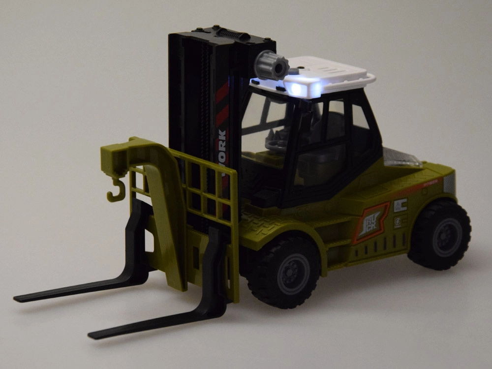 Due pulsanti controllano 4 diversi suoni (avviamento, retromarcia, sollevamento, clacson) accompagnati da una luce bianca lampeggiante per un’esperienza di gioco massima.