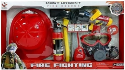 La confezione include elmetto, maschera, terminale del tubo, accetta, piede di porco, estintore manuale, ricetrasmittente a onde corte e orologio. Il set è fornito in confezione regalo con finestra, perfetto come idea regalo per i piccoli appassionati dei pompieri.