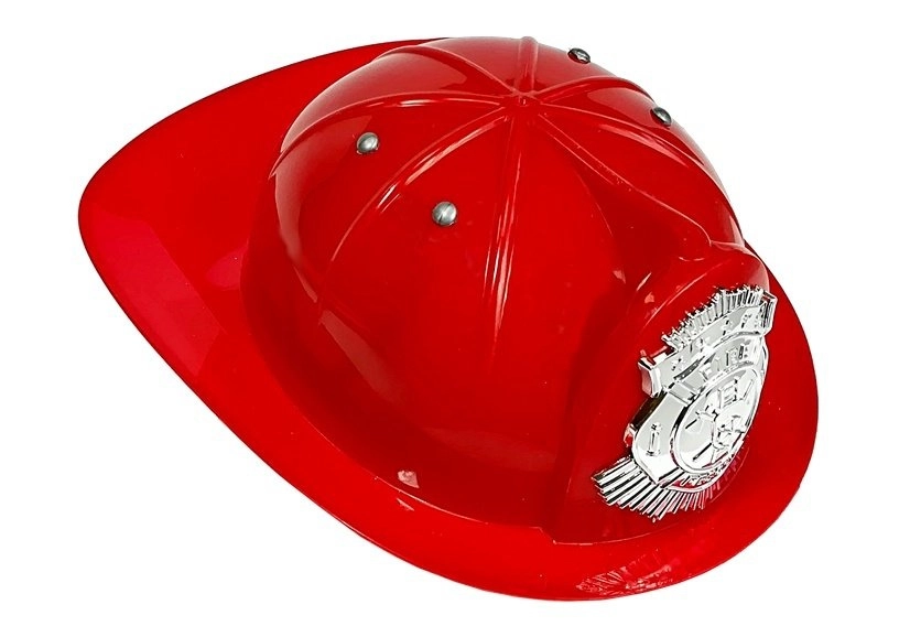 Elmetto rosso per bambini con rivetti di aerazione ed emblema: confortevole da indossare e perfetto per completare il costume da pompiere.