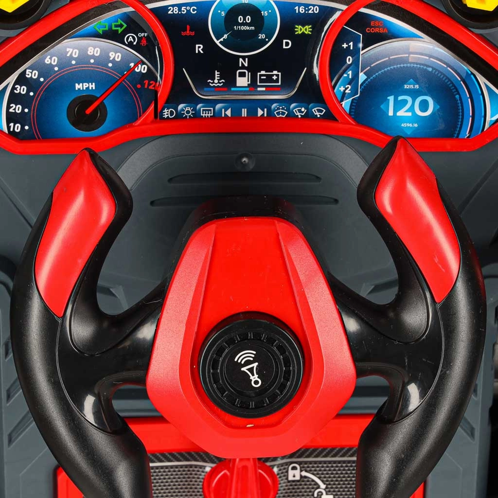 Suoni del motore e del clacson, luci lampeggianti, pulsante di avviamento e luce di emergenza trasformano la cameretta in una vera officina.