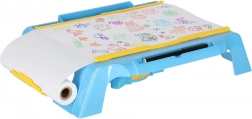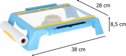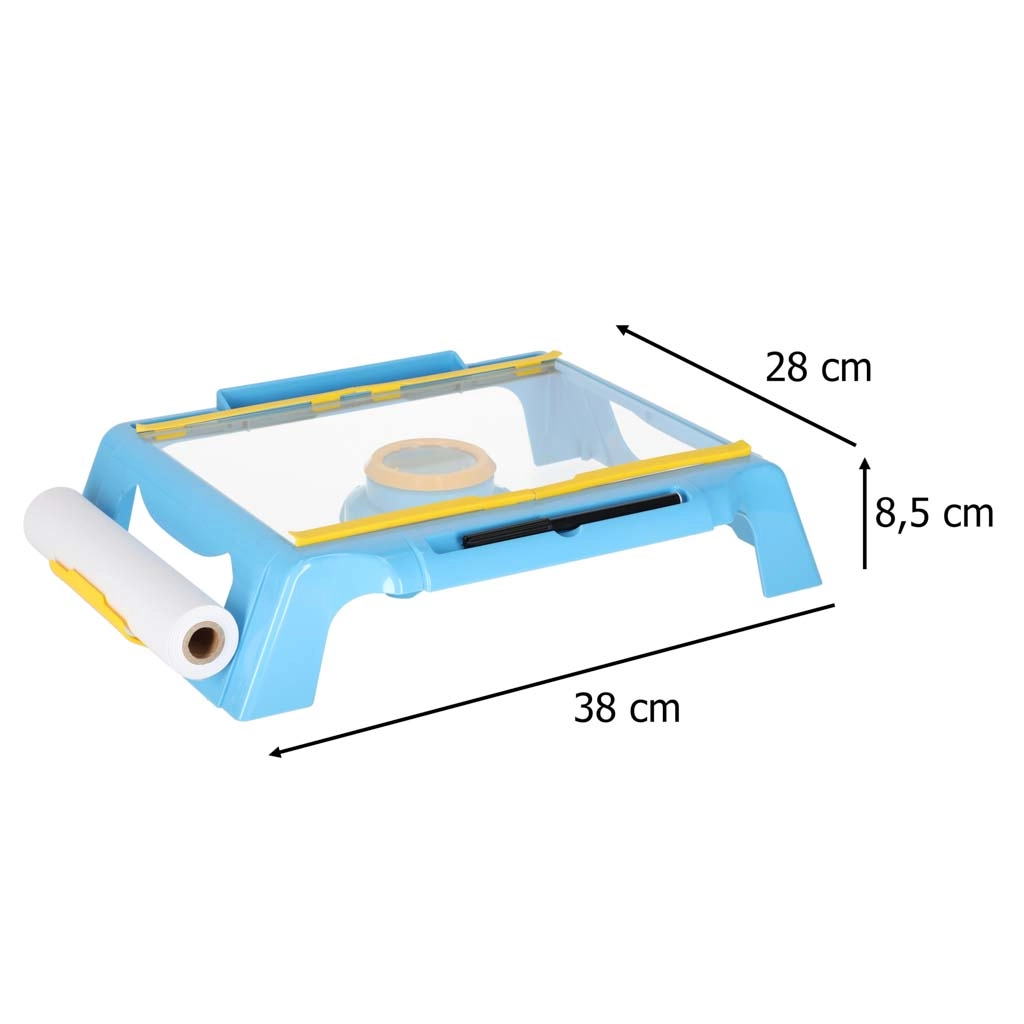 La solida base in plastica con piano di lavoro inclinato e portarotolo di carta garantisce condizioni confortevoli per disegnare a casa e in viaggio.