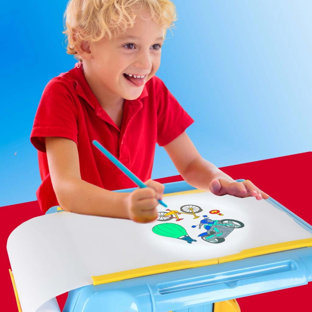 Questo proiettore educativo proietta le immagini sulla carta, così i bambini possono ricalcare facilmente e acquisire gradualmente sicurezza nel disegno. Grazie alla messa a fuoco regolabile e al tavolino stabile, lavorare è comodo sia sul tavolo sia a terra. La combinazione blu-gialla è resistente e sicura per i piccoli artisti.