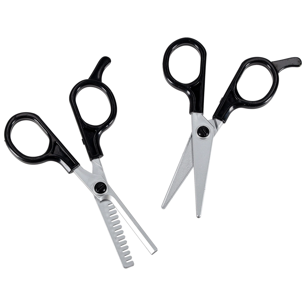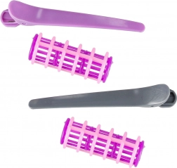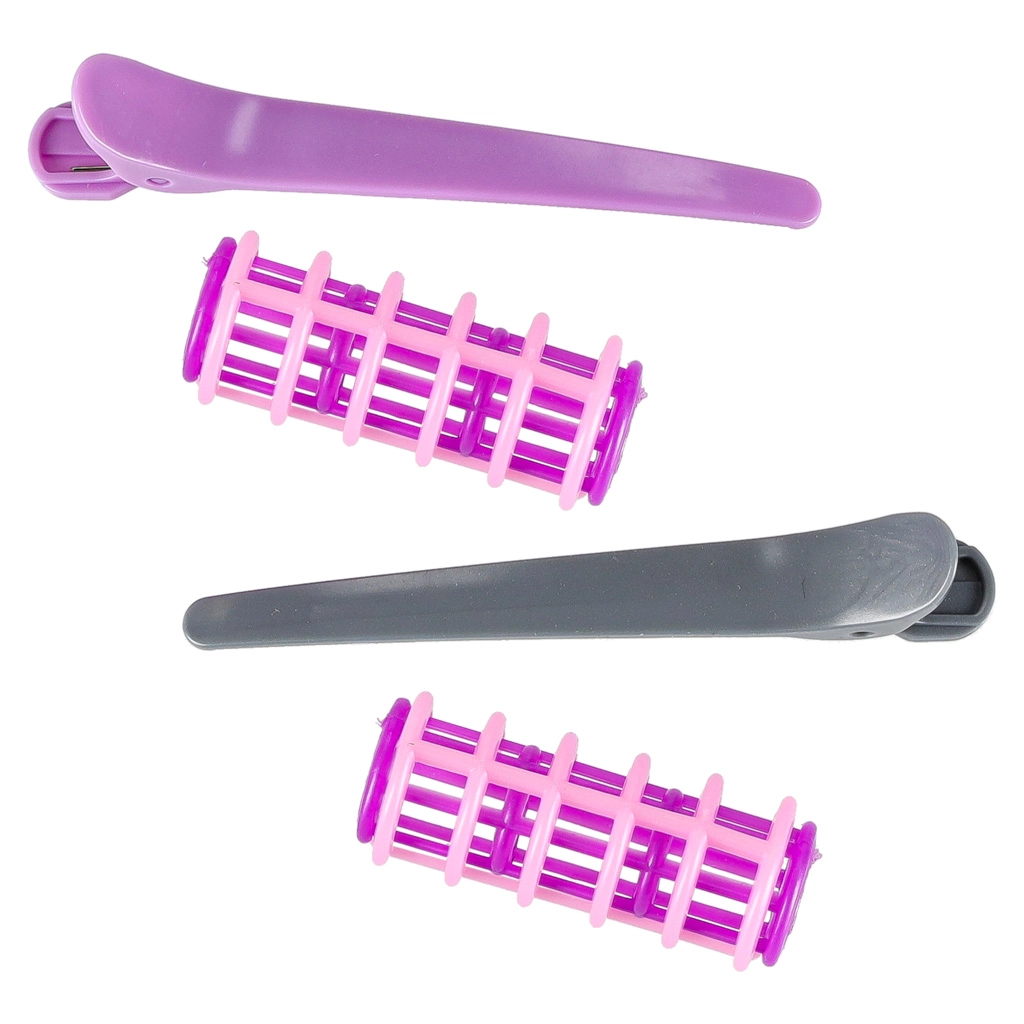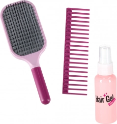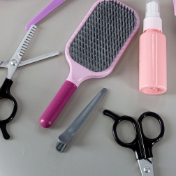 Spazzola, pettine, forbici senza lame affilate, forbici sfoltiture, bigodini, clip e boccetta vuota – un kit completo per storie di parrucchiere ogni giorno.