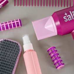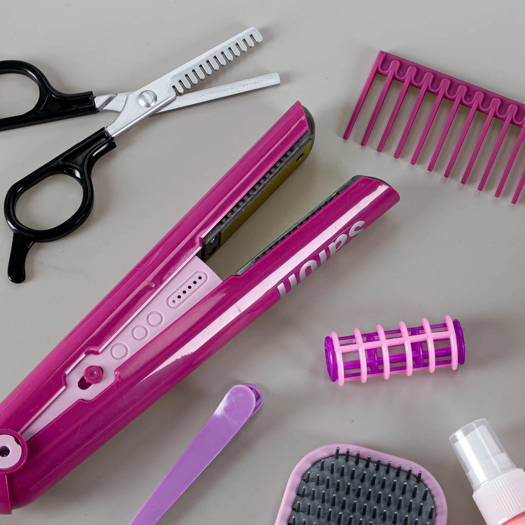 Nella confezione trovi tutto per un cambio look completo: phon con due beccucci (concentratore e diffusore), piastra per bambini con supporto, spazzola e pettine, 2 tipi di forbici senza bordi taglienti, bigodini e clip e una boccetta vuota per lo “styling”. L’intero set è leggero, resistente e sicuro per bambini dai 3 anni.