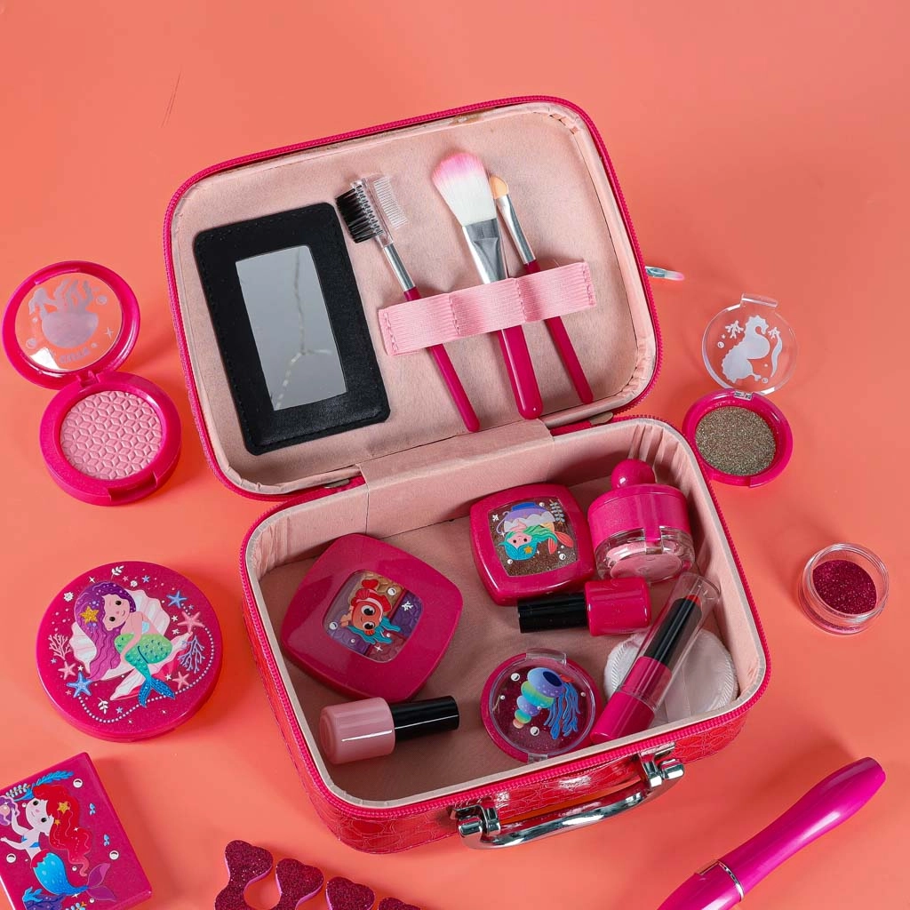 La valigetta è leggera, resistente e grazie allo specchietto e a un’organizzazione studiata ogni accessorio ha il suo posto. I bambini imparano le basi della cura di sé, sviluppano la motricità e il senso del colore – tutto questo senza bisogno di veri cosmetici.