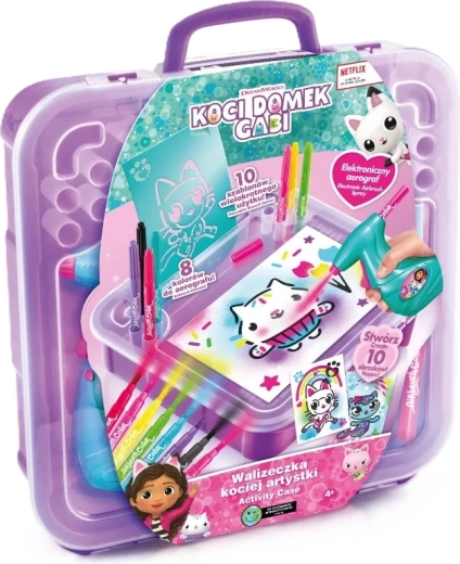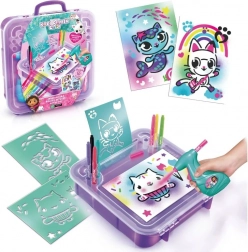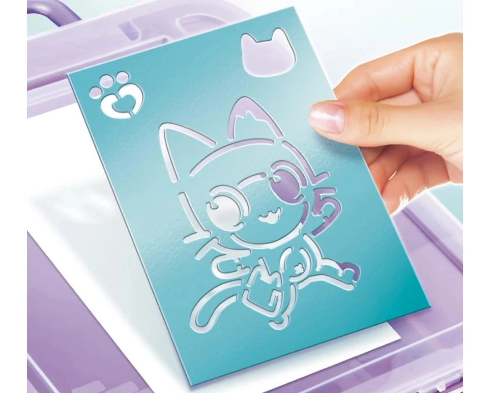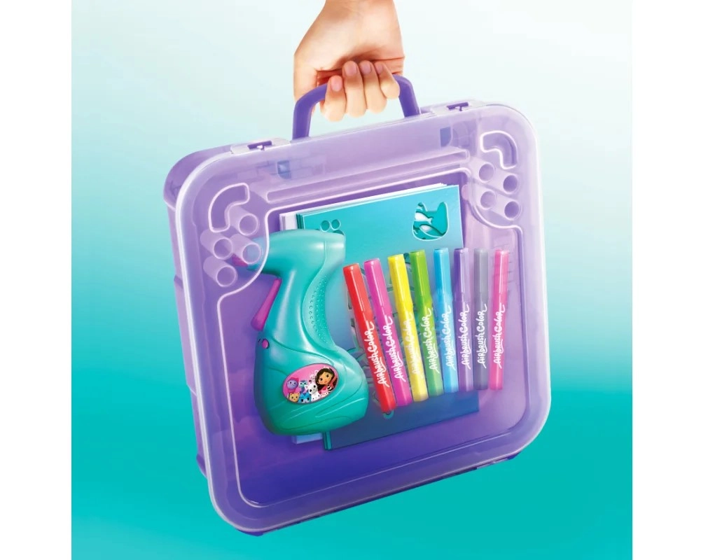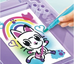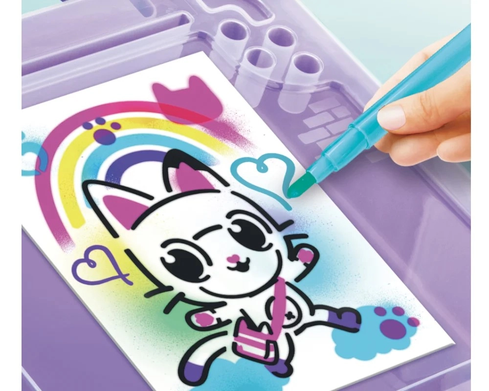 Questo set creativo portatile è un regalo perfetto per i piccoli artisti che amano colori e fantasia. Basta inserire il pennarello nel dispositivo, premere il pulsante e iniziare a spruzzare: il facile utilizzo è adatto anche ai più piccoli. Il design ispirato al cartone La Casa delle Bambole di Gabby conquisterà tutti i fan dei simpatici micetti.