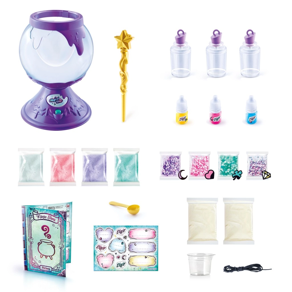 Versa semplicemente la polvere per slime, aggiungi l’elisir e le decorazioni, mescola con la bacchetta stellata dorata e guarda la magia prendere vita nel calderone. Gli slime finiti si conservano in splendide boccette con cordino, da indossare al collo. Set creativo ideale per principianti e per piccoli maghi e streghette.