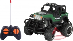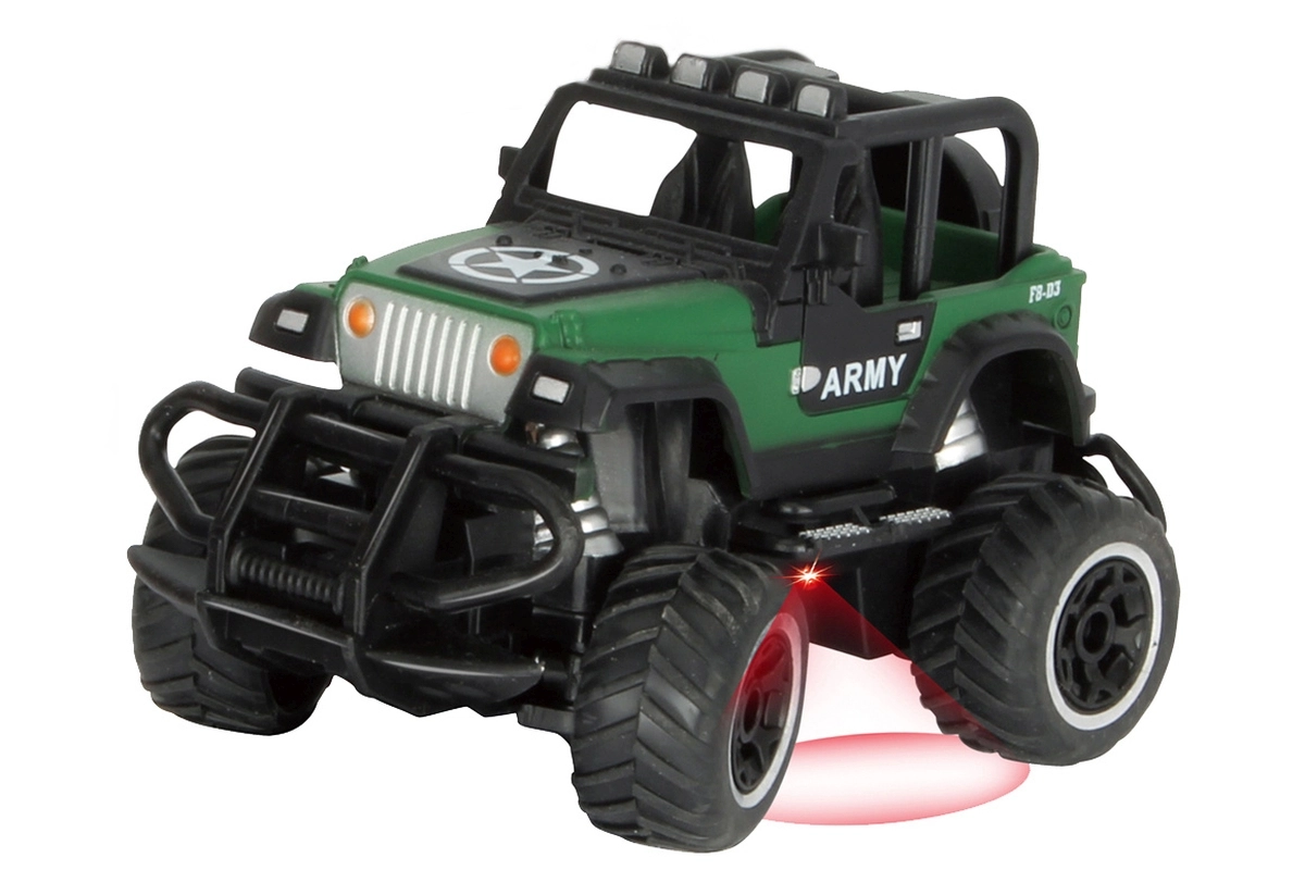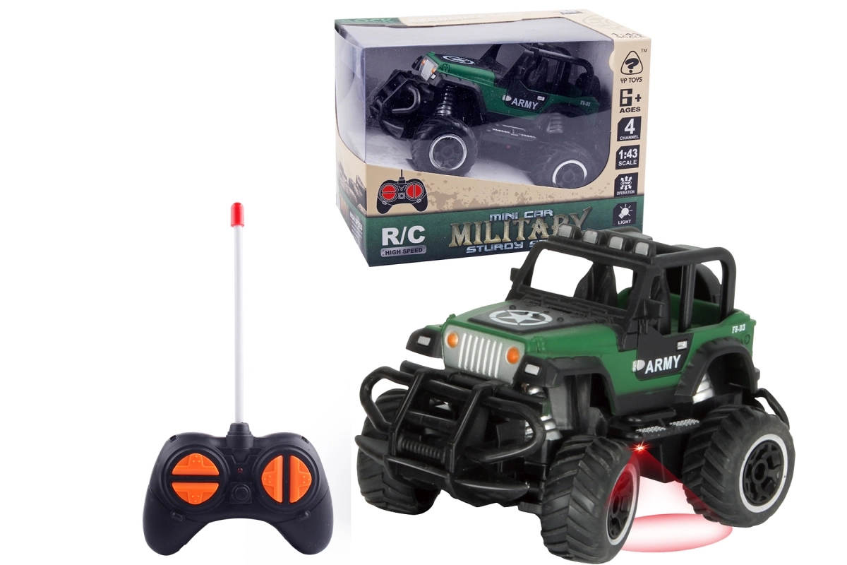 Compatta auto RC militare fuoristrada in scala 1:43 che farà felice ogni piccolo pilota. Offre facile controllo, struttura resistente e divertimento in casa e all'aperto. Alimentazione con 4× batterie AA (non incluse). Adatto ai bambini dai 6 anni.