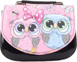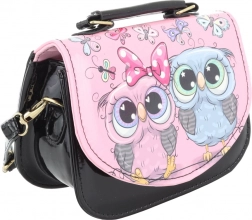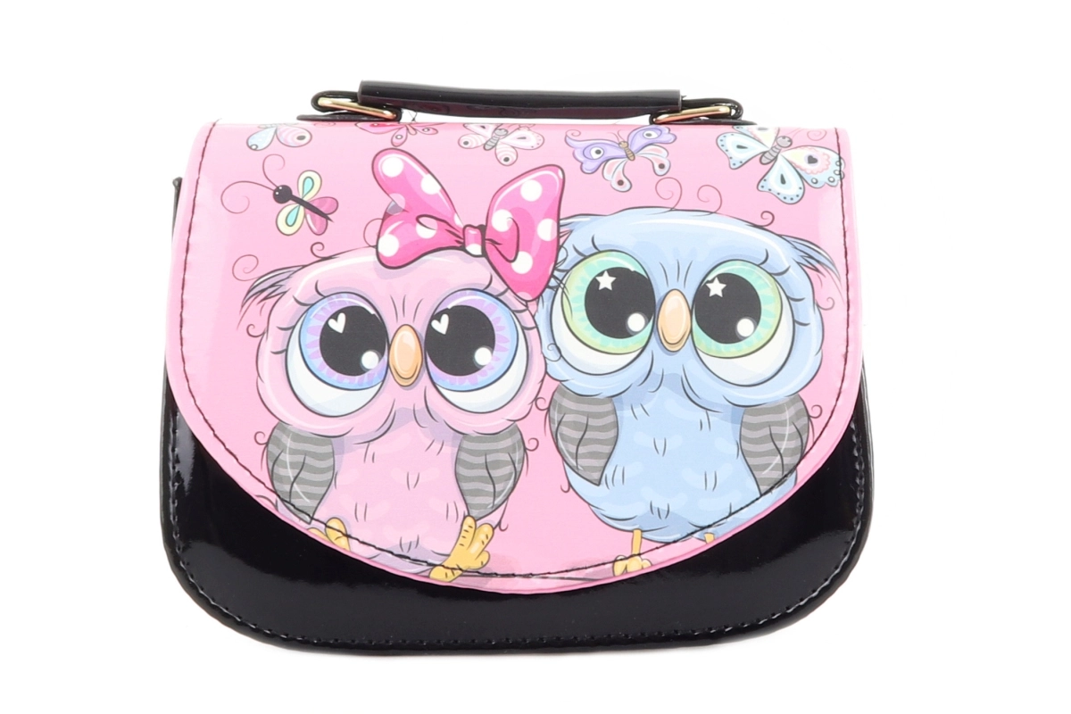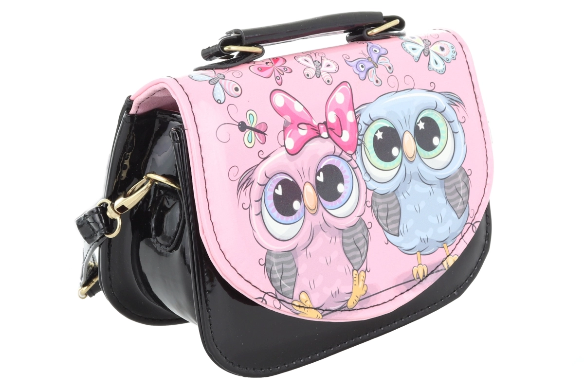 Adorabile borsetta per bambine con motivo di gufetti, ideale per piccole fashioniste. Dimensioni compatte e finitura nera lucida, arricchita da una patta colorata con stampa di gufetti e farfalle, la rendono un accessorio stiloso per tutti i giorni. Offre un comodo manico, una chiusura pratica ed è adatta ai bambini a partire da 3 anni.