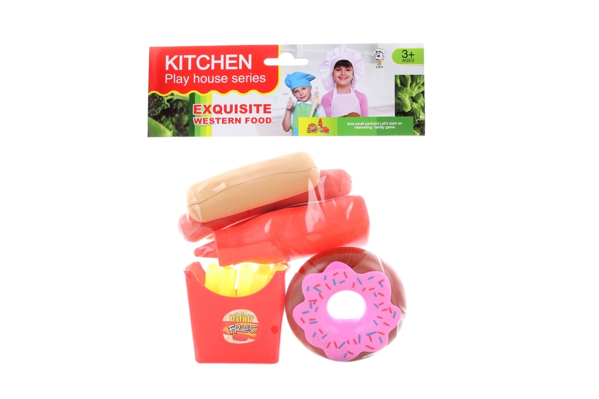 Divertente set in plastica per piccoli cuochi con le prelibatezze preferite – hot dog, patatine fritte in scatolina, donut e ketchup. Ideale per il gioco di cucina, lo sviluppo della fantasia e della motricità fine. Confezionato in bustina, adatto dai 3 anni.