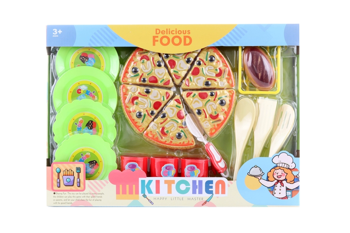 Divertente set per piccoli chef: pizza di plastica divisa in 6 fette con piattini, tazzine e utensili per la preparazione e il servizio. Ideale per giocare alla cucina, stimola creatività, gioco condiviso e motricità fine. Confezionato in scatola, adatto ai bambini dai 3 anni.