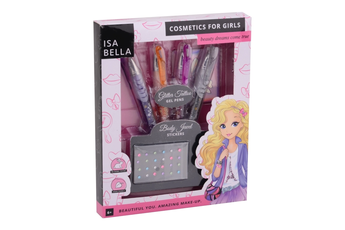 Un creativo set per tatuaggi per bambine che unisce divertimento e stile. Include 4 penne per tatuaggi glitterate e pratici accessori per creare facilmente tatuaggi temporanei. Ideale per bambini dai 6 anni, stimola la fantasia e la motricità fine.