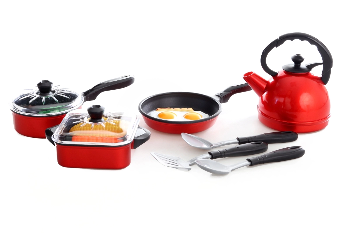 Teiera, padella, casseruola, pentola, spatole, cibi finti