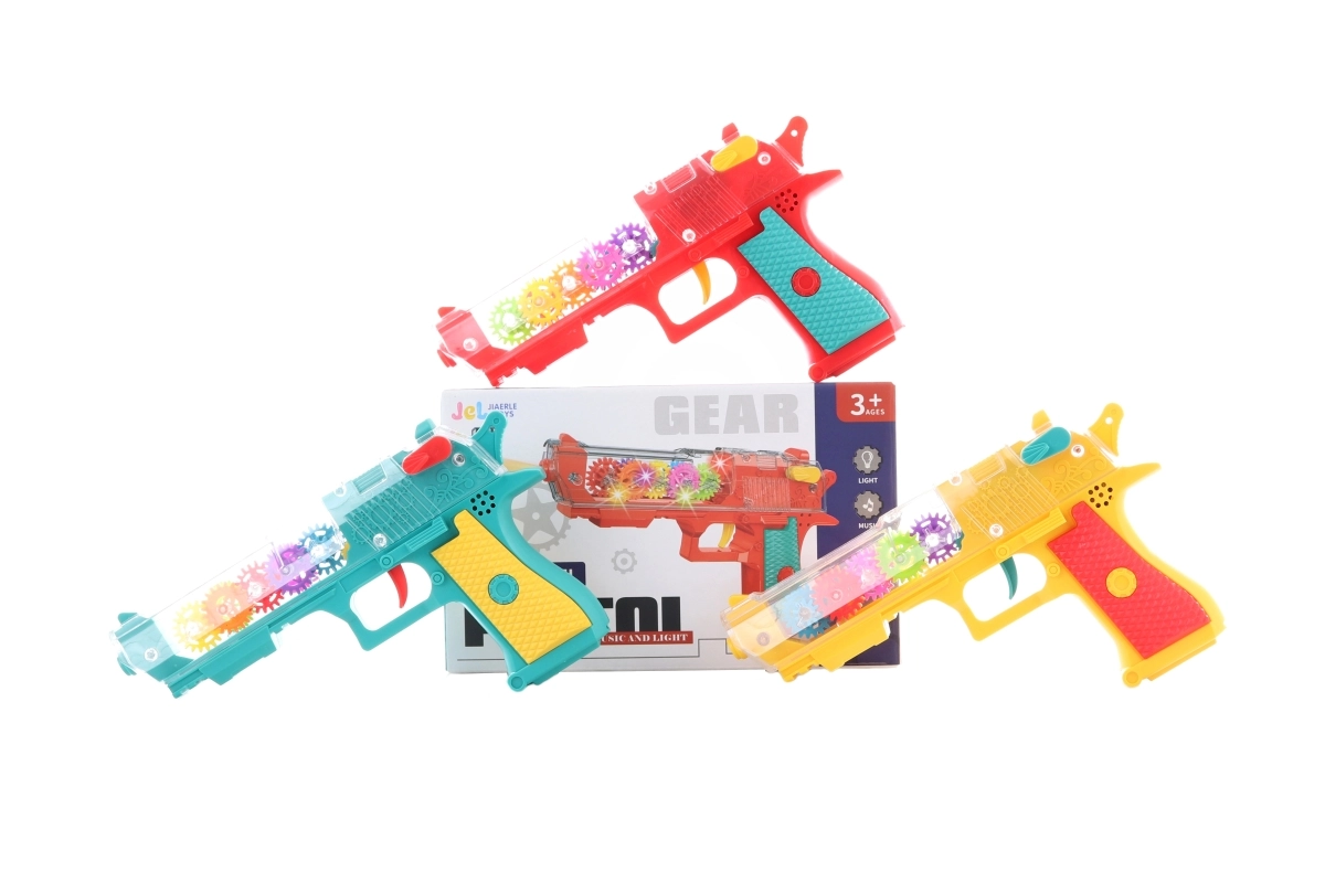 Divertente pistola giocattolo a batterie che offre tanta azione: premendo il grilletto si illumina, emette suoni di sparo e fa girare gli ingranaggi. Giocattolo ideale per bambini dai 3 anni, realizzato in plastica resistente.