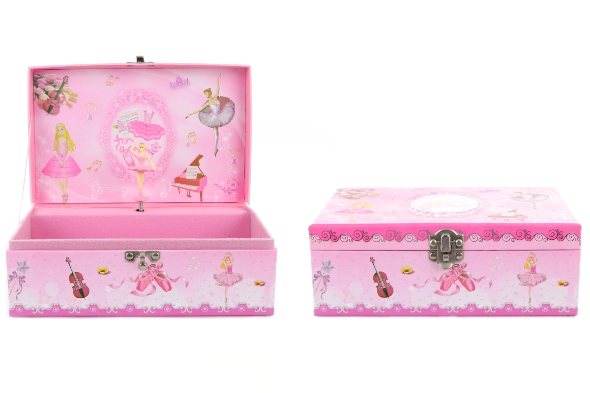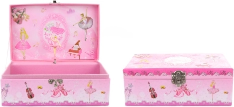 Questo elegante carillon portagioie con ballerina è un ottimo complemento per la cameretta dei bambini. Dopo aver girato la chiavetta, la ballerina inizia a ruotare e il portagioie suona una melodia, mentre lo specchietto interno aiuta a fare toilette. Le dimensioni di circa 22,5 × 14,5 × 8,5 cm offrono spazio sufficiente per anellini, braccialetti o altri piccoli oggetti.