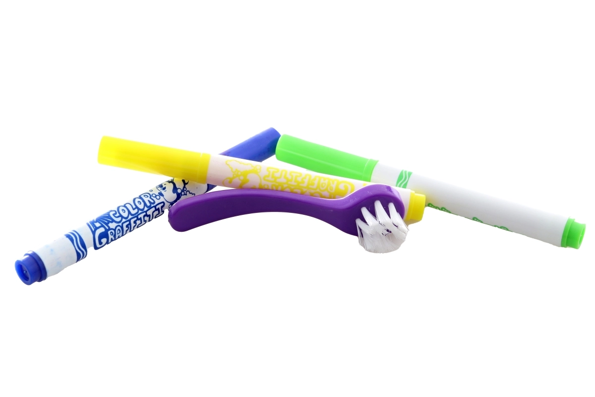 Il set comprende pennarelli dai colori vivaci e uno strumento viola con pennellino per dettagli e piccoli ritocchi.