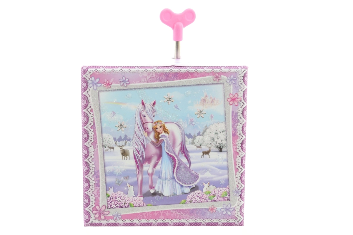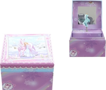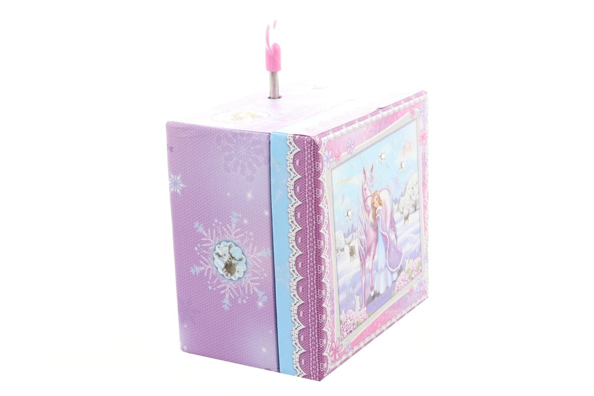 Affascinante scatola musicale portagioie con motivo principessa e cavallo che trasforma ogni stanza in un regno da fiaba. Dopo aver caricato la chiavetta, all’interno ruota la figurina dell’unicorno che danza elegantemente al ritmo della melodia. Lo specchietto interno facilita la prova di gioielli e piccoli accessori.