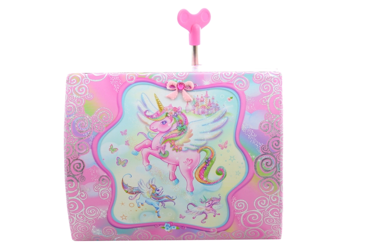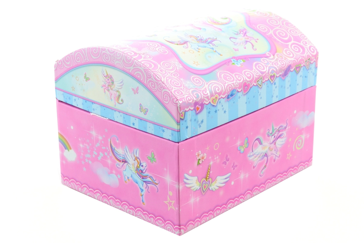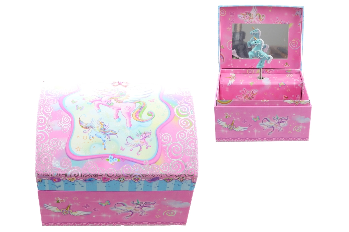 Una magica scatola portagioie rosa con motivo di unicorni che farà felice ogni piccola amante dei dettagli. Dopo aver caricato il meccanismo, all'interno si mette a girare la figurina della ballerina e risuona una delicata melodia. Non mancano lo specchietto interno e lo spazio per i piccoli tesori. Ideale come regalo e come splendida decorazione per la cameretta dei bambini. Meccanismo musicale, ballerina girevole, specchietto interno, dolce motivo con unicorni.