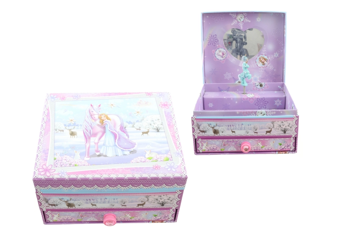 Una magica scatola portagioielli musicale con tema unicorno che farà felice ogni amante dei piccoli tesori. Dopo aver caricato la chiavetta, all’apertura del coperchio la figurina inizia a danzare e risuona una piacevole melodia. All’interno trovi uno specchietto, pratico per provare i gioielli, e in basso un cassettino estraibile per anelli, braccialetti e altre minuterie. Le dimensioni compatte ca. 16 × 14 × 9 cm e i delicati motivi fiabeschi rendono questa scatola un bellissimo complemento per la cameretta e un’ottima idea regalo.