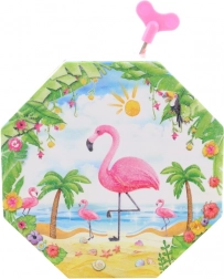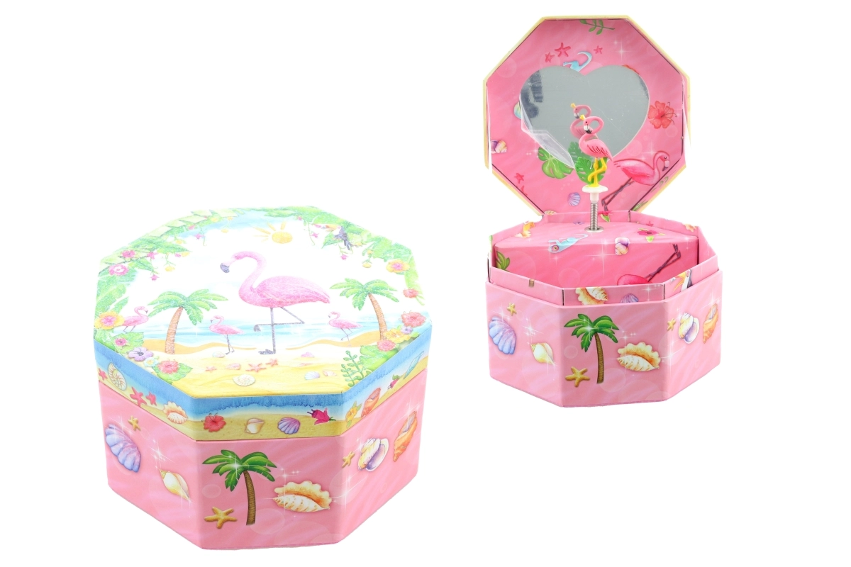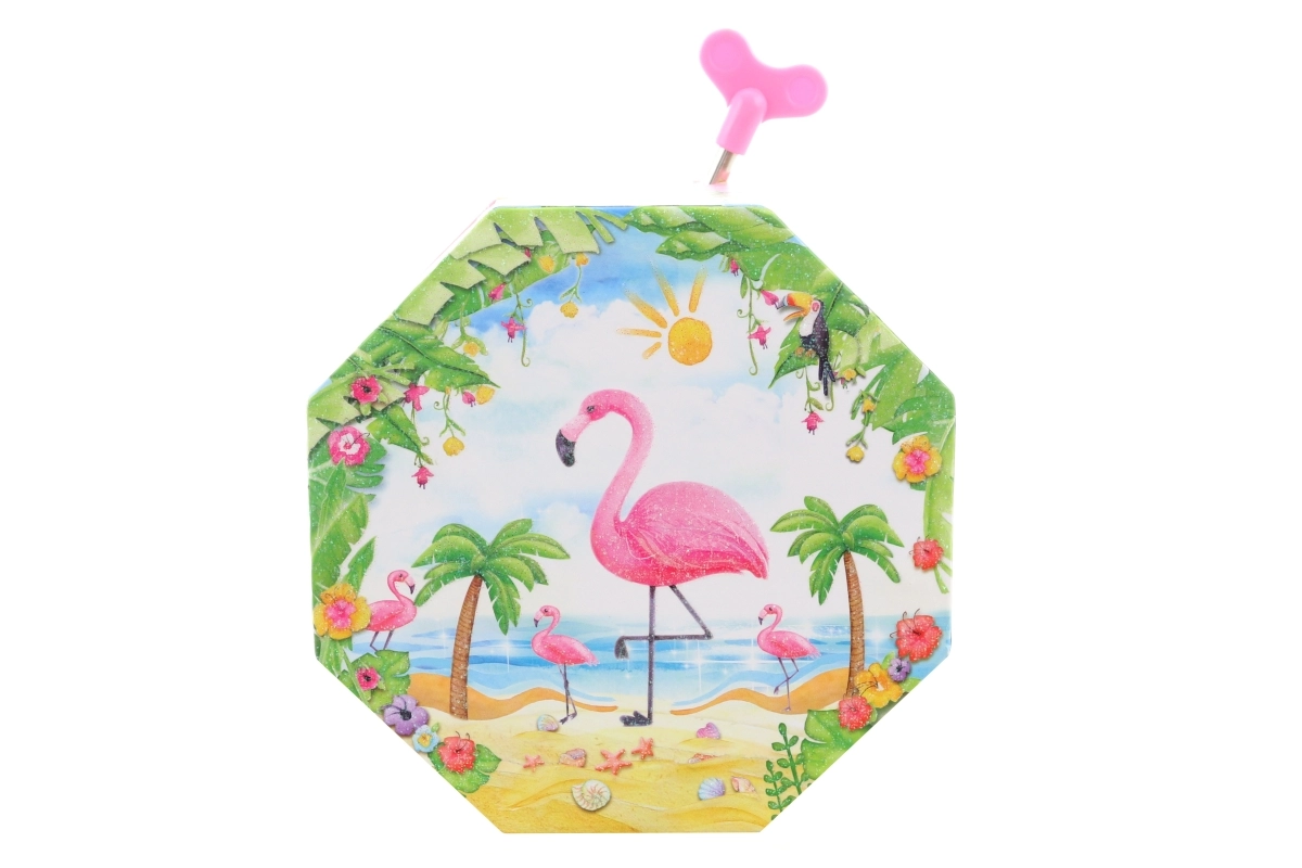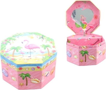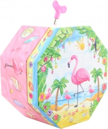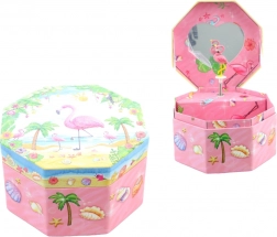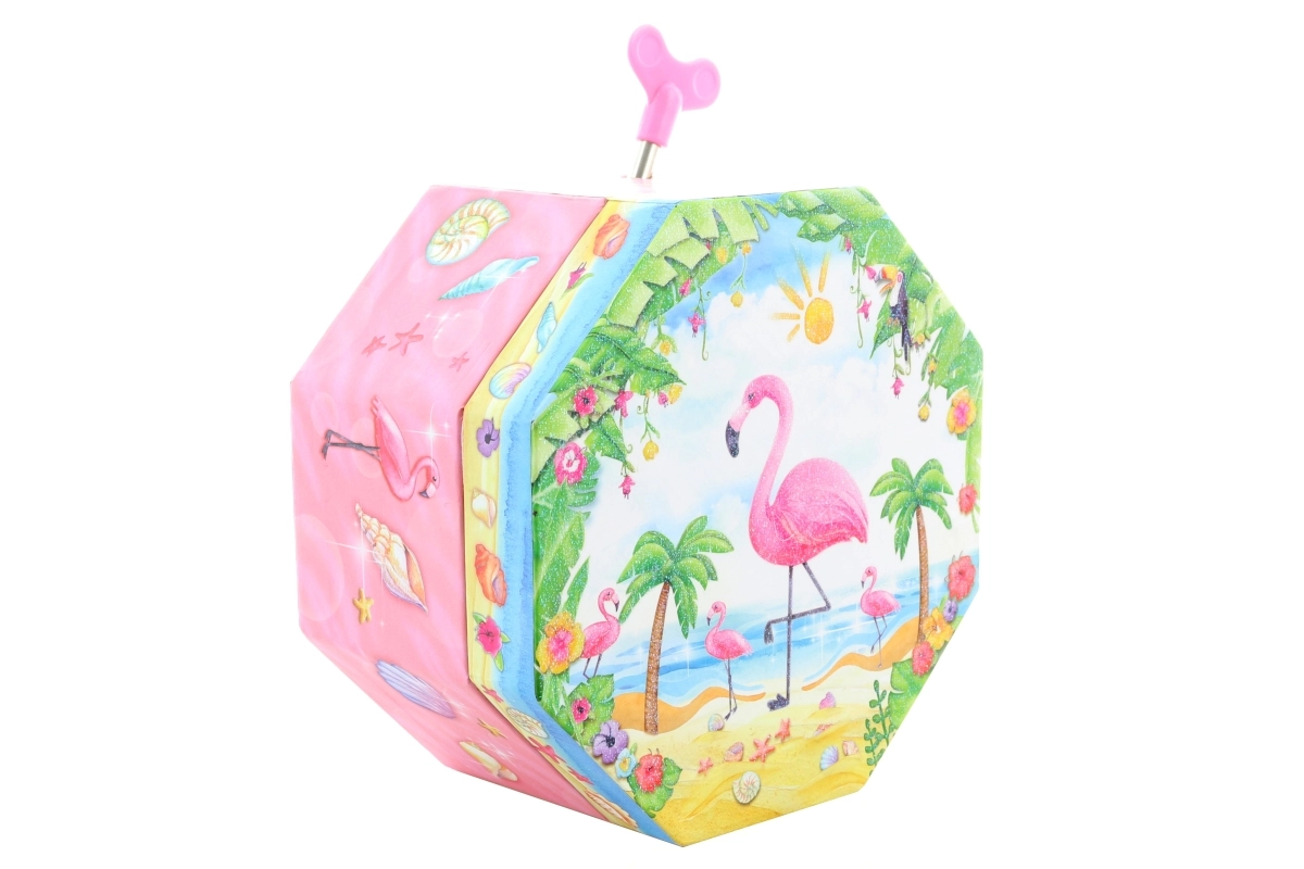 Questa incantevole scatola portagioielli musicale in color rosa si distingue per la forma ottagonale e il motivo tropicale con fenicottero, palme e conchiglie. All’apertura appare un fenicottero danzante davanti a uno specchietto a cuore, che ruota dopo aver caricato la chiavetta e accompagna il riporre dei gioielli con una piacevole melodia.