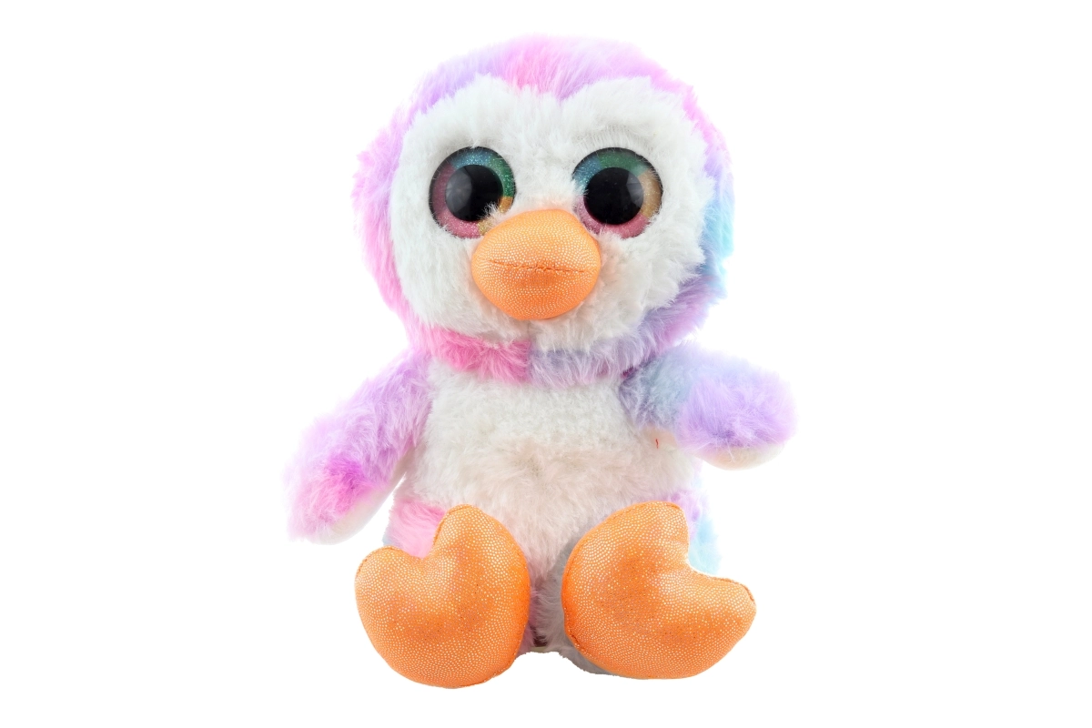 Grandi occhi brillanti e delicate tonalità pastello (rosa, viola, azzurro e bianco) rendono il pinguino un dolce complemento per la cameretta dei bambini.