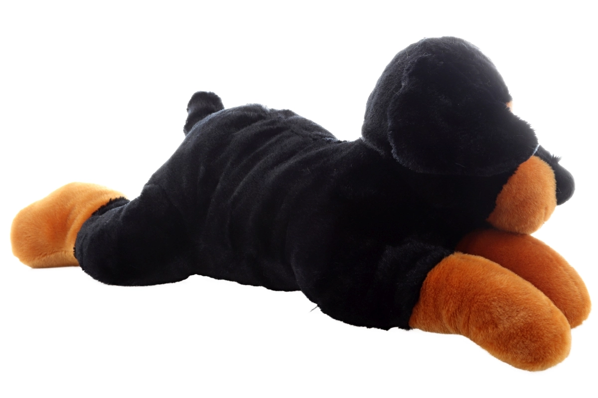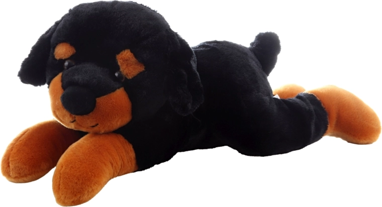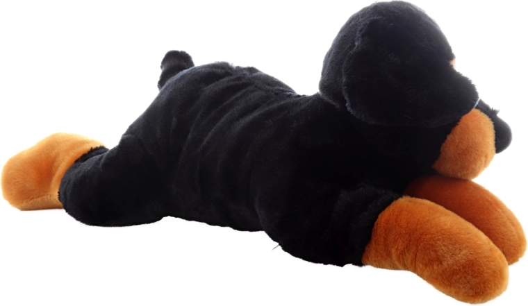 Questo cane di peluche, in colorazione realistica con pelliccia nera e zampette e musetto marroni, è pronto per infinite coccole. Grazie alla superficie soffice e all'imbottitura di qualità è piacevole al tatto e si adatta perfettamente all'abbraccio del bambino.