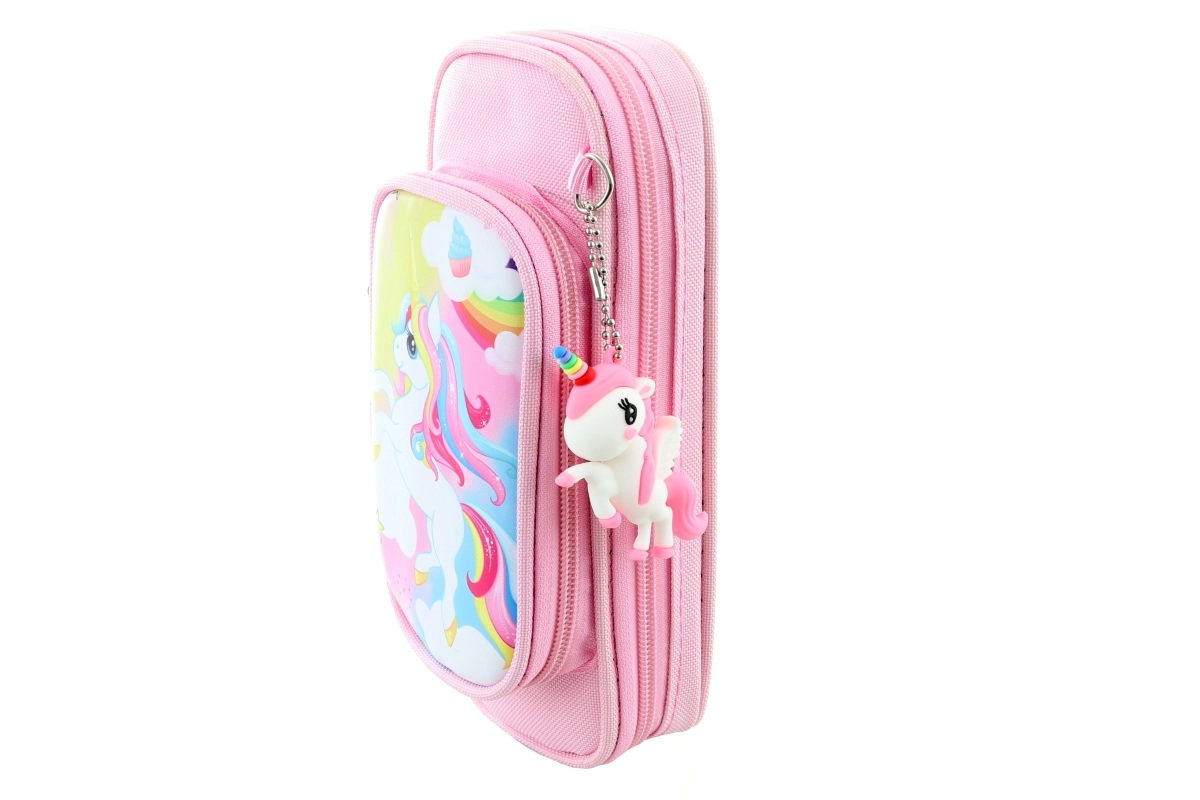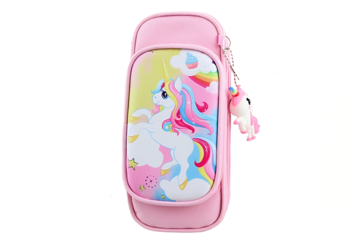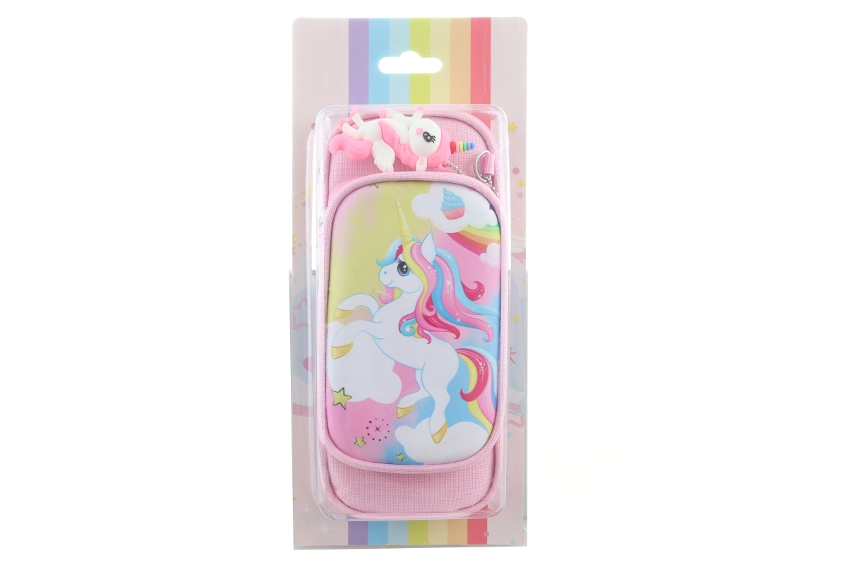 Un astuccio alla moda con motivo unicorno, ideale per la scuola e il tempo libero. Grazie alle due tasche con cerniera separerete facilmente la cancelleria dai piccoli oggetti come elastici, temperamatite o adesivi. Il pannello frontale 3D con arcobaleno e unicorno dona un look giocoso, mentre le cerniere di qualità assicurano un’apertura scorrevole.