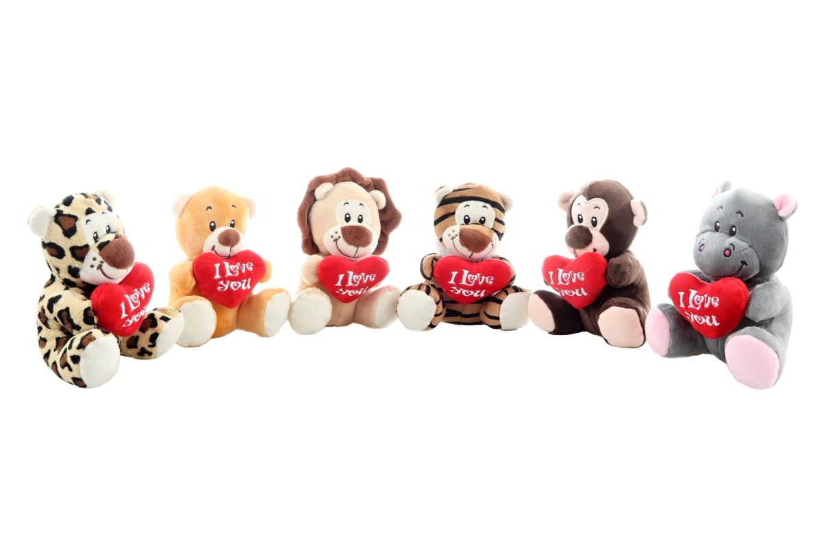 Un dolcissimo animaletto di peluche con cuoricino rosso “I Love You” farà felici bambini e adulti. Puoi scegliere tra più varianti: tigre, leone, leopardo, orsetto, scimmietta e ippopotamino. Il giocattolo è morbidissimo, soffice al tatto e ideale come regalo d’amore, compagno della nanna e decorazione per la cameretta. Adatto da 0+.