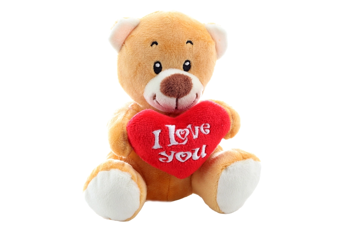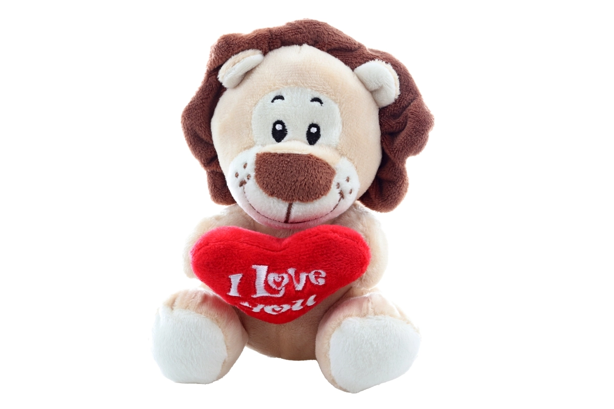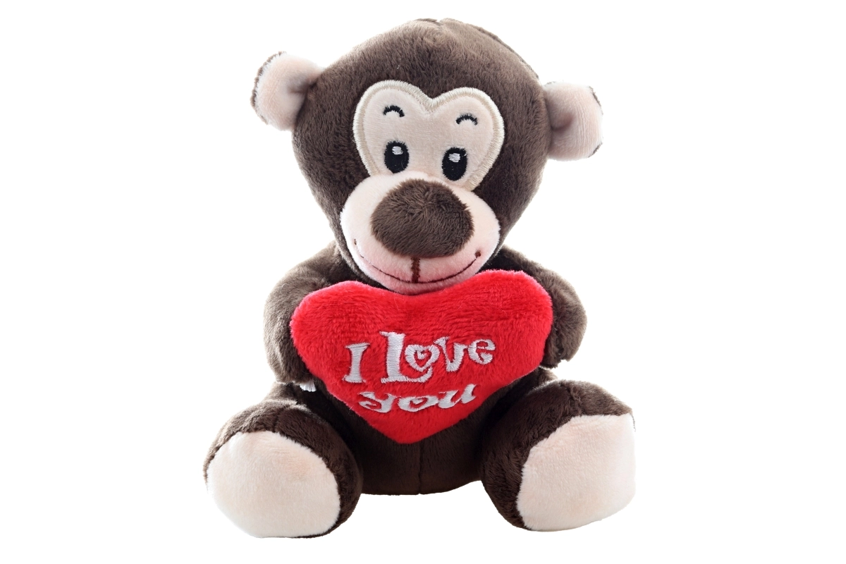 Il vistoso cuore rosso con scritta ricamata dona fascino al peluche e lo rende un regalo d’amore perfetto.