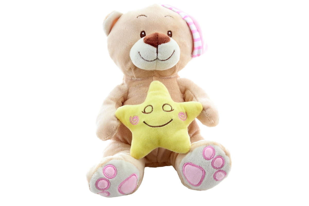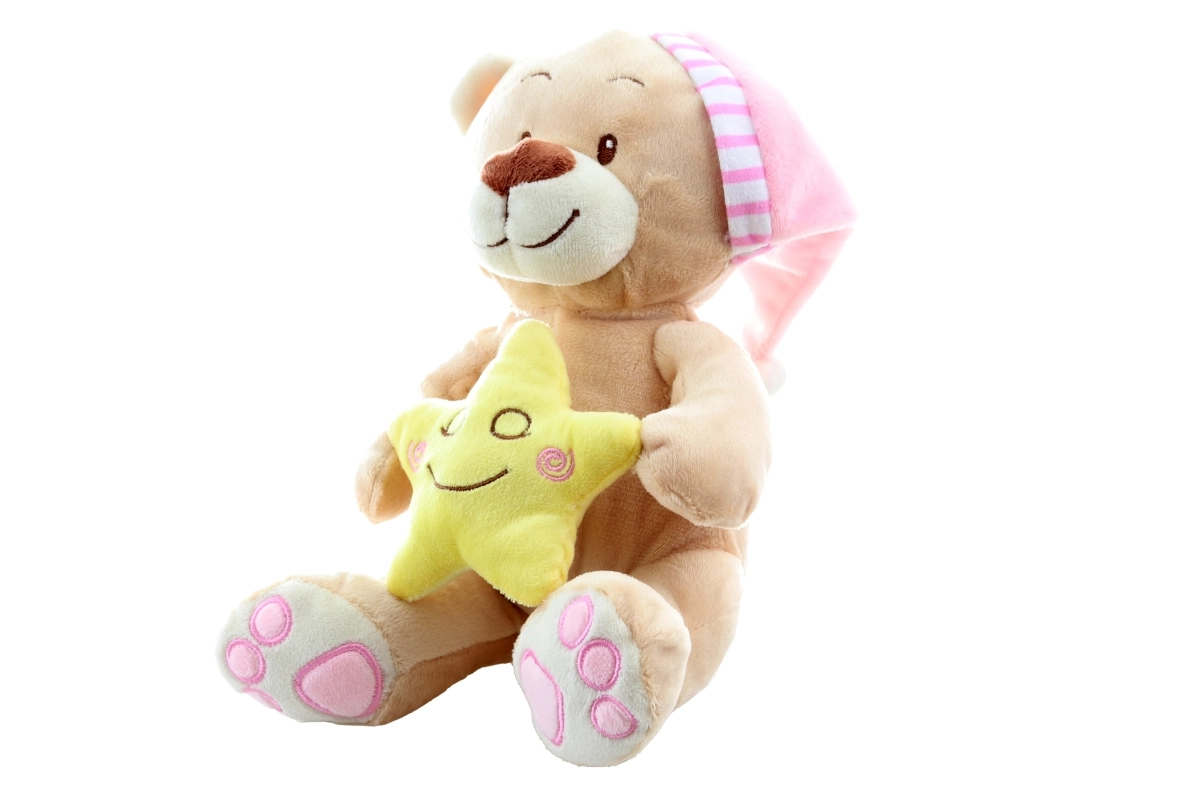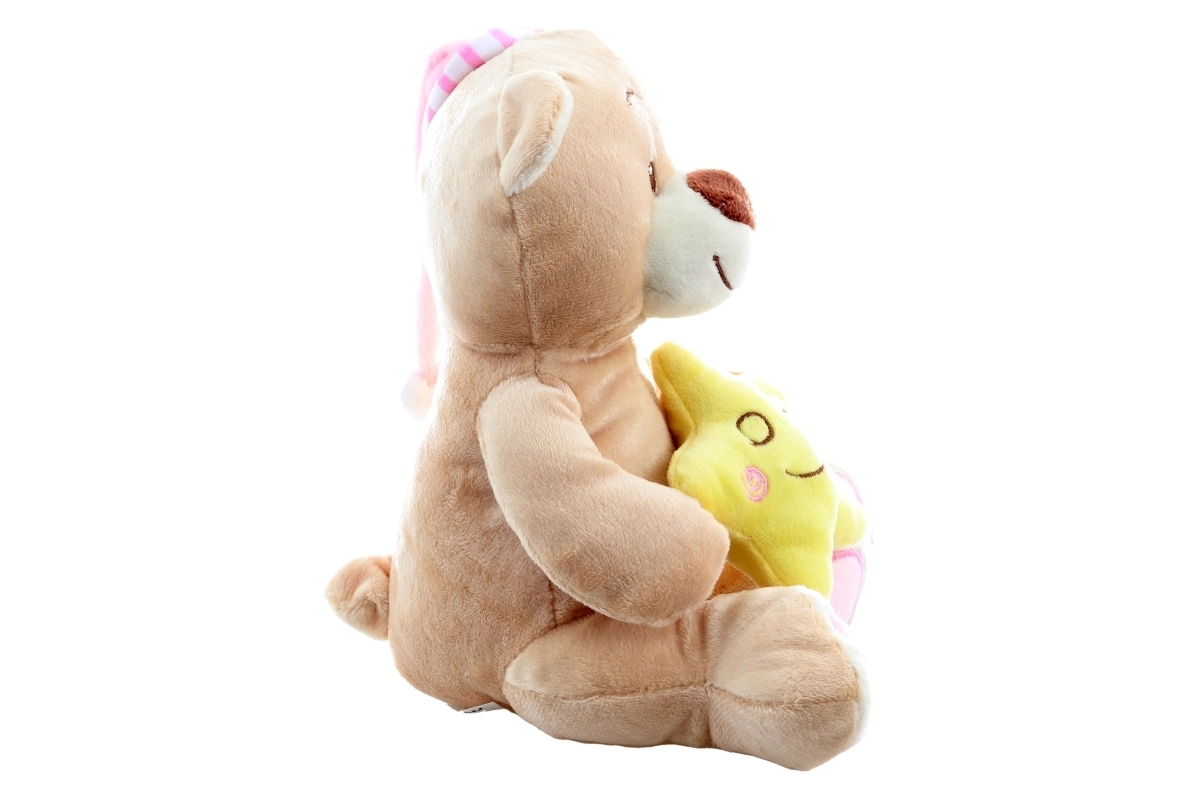 Questo orsetto soffice con cappellino da notte rosa e una delicata stellina gialla da tenere nel palmo della mano dona ai bambini una sensazione di sicurezza e un sonno tranquillo. Grazie all’ottima fattura e ai dettagli ricamati è adatto anche ai neonati.