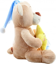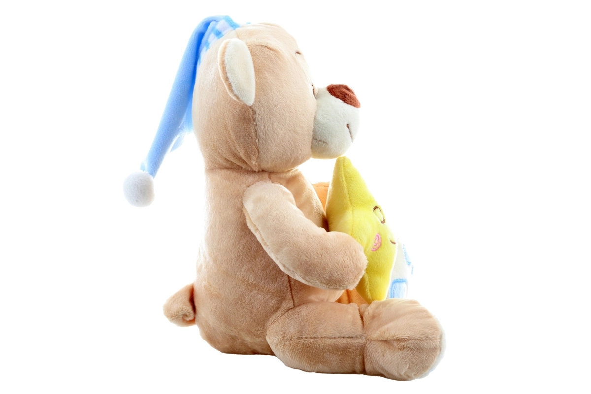 Peluche morbidissimo, cappellino blu rilassante e stellina gialla creano un’atmosfera piacevole prima di dormire.