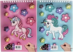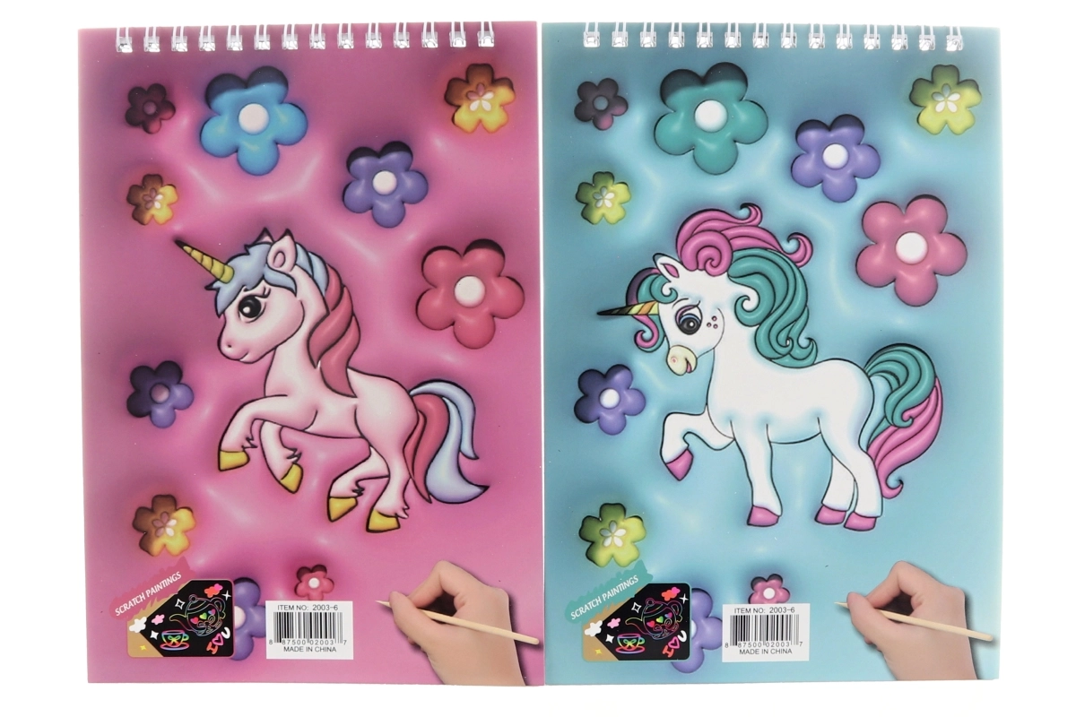 Scoprite un modo divertente di disegnare con il quaderno graffiabile a tema unicorno. Basta grattare delicatamente lo strato nero e sotto compaiono colori vivaci che trasformano ogni tratto in un’immagine magica. Grazie alla rilegatura a spirale le pagine si girano facilmente e il quaderno mantiene bene la forma.