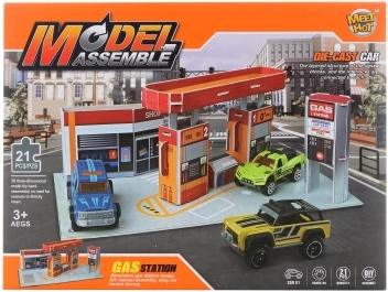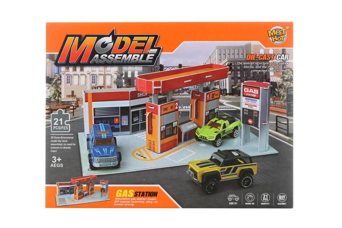 Divertente set da costruzione per i piccoli appassionati di auto: contiene tutto il necessario per assemblare la propria stazione di rifornimento e una macchinina in metallo. I pezzi sono in cartone morbido, facili da montare e creano un ambiente di gioco realistico. La stazione assemblata misura 23,5 × 13 × 9,3 cm ed è ideale per bambini dai 3 anni.
