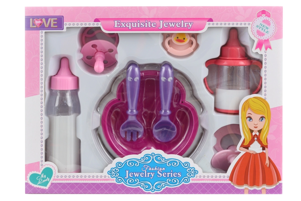 Biberon, piattino con posate, 3 ciucci, tazzina
