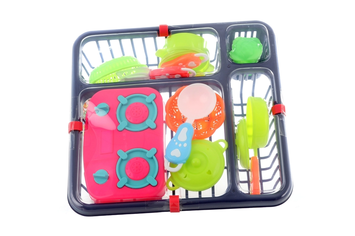 Divertente set in plastica per piccoli chef, comprende un fornello giocattolo, stoviglie e uno scolapiatti. Ideale per sviluppare fantasia, abilità sociali e motricità fine. Confezione compatta con dimensioni circa 25 × 26,5 × 7 cm, adatta a casa e in viaggio. Consigliato per bambini da 3 anni.