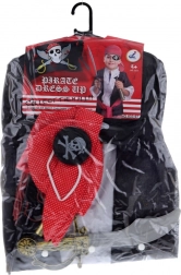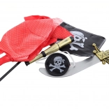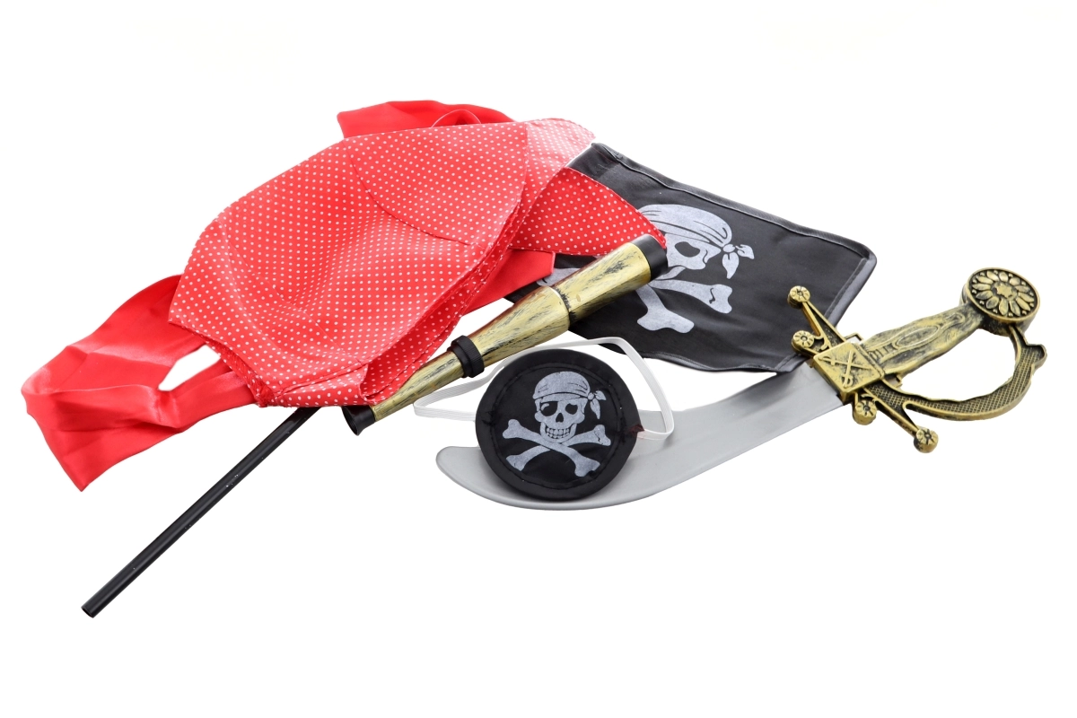 - Mantello, pantaloncini, sciabola, bandiera da pirata, foulard per la testa, cintura, fascia per l’occhio