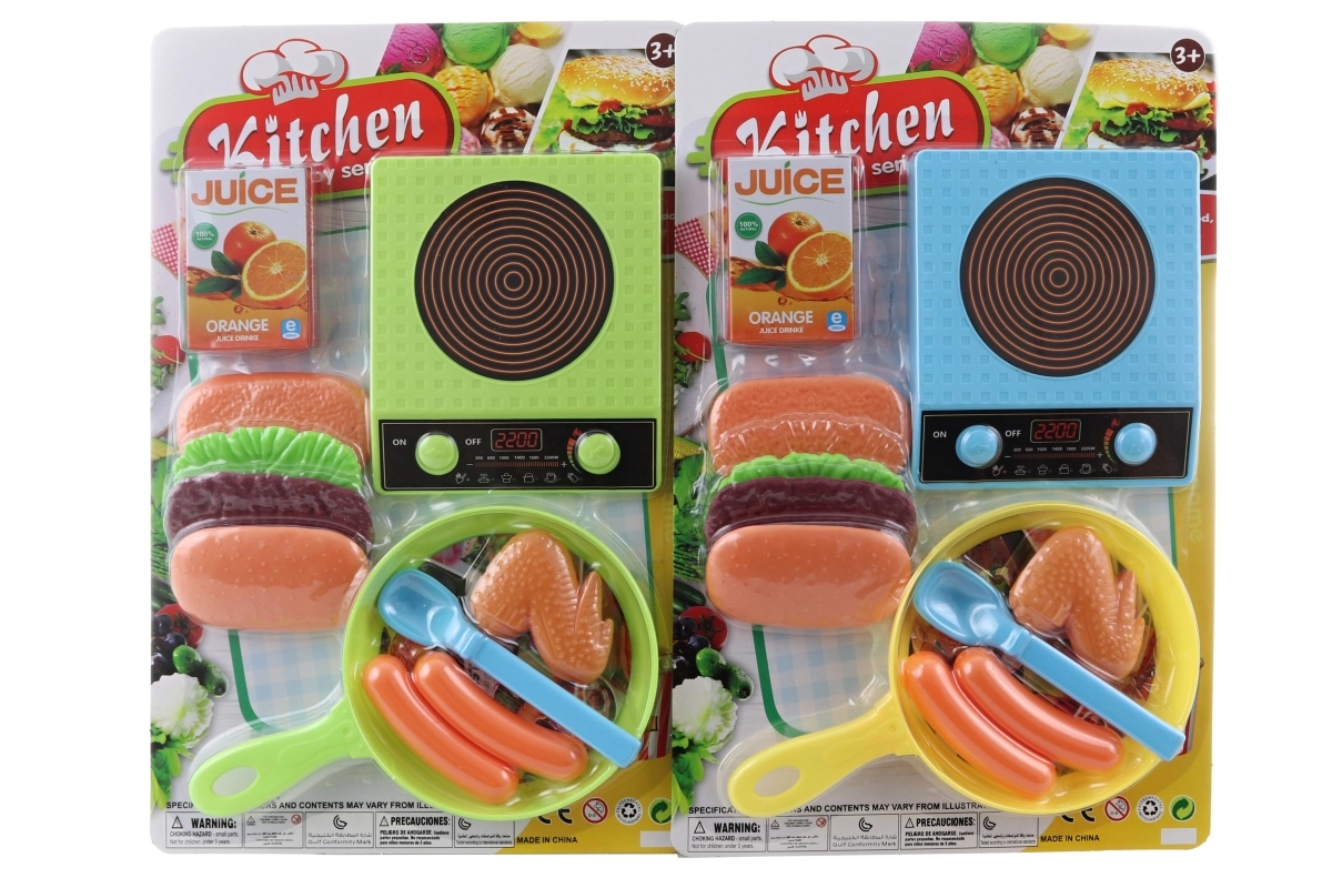 Divertente set da cucina per piccoli chef con fornello, padella e cibo finto per un gioco di cucina realistico. Confezionato su blister, adatto ai bambini da 3 anni.