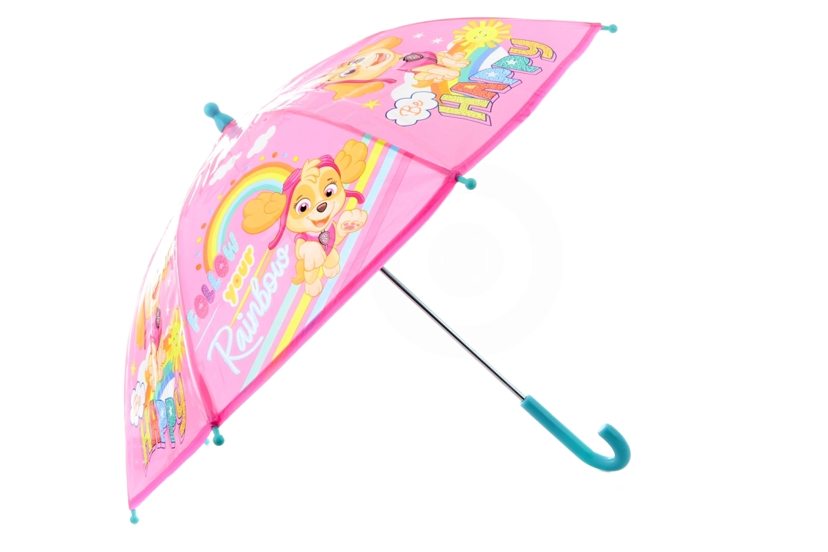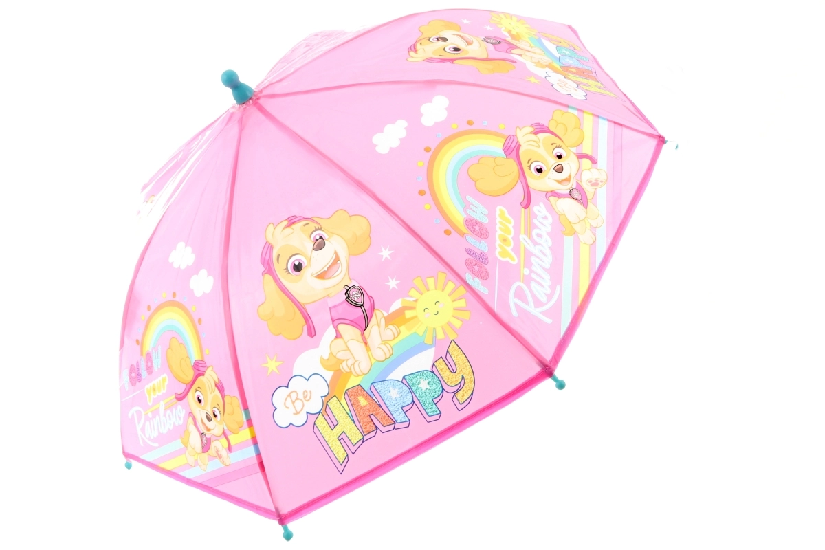 Questo elegante ombrello rosa, con allegre immagini di cagnolini, arcobaleni e scritte come “Be Happy” e “Follow your Rainbow”, farà felice ogni piccolo fan di PAW PATROL. Grazie alla forma a cupola offre una protezione affidabile dalla pioggia e al tempo stesso ha un look splendido.
