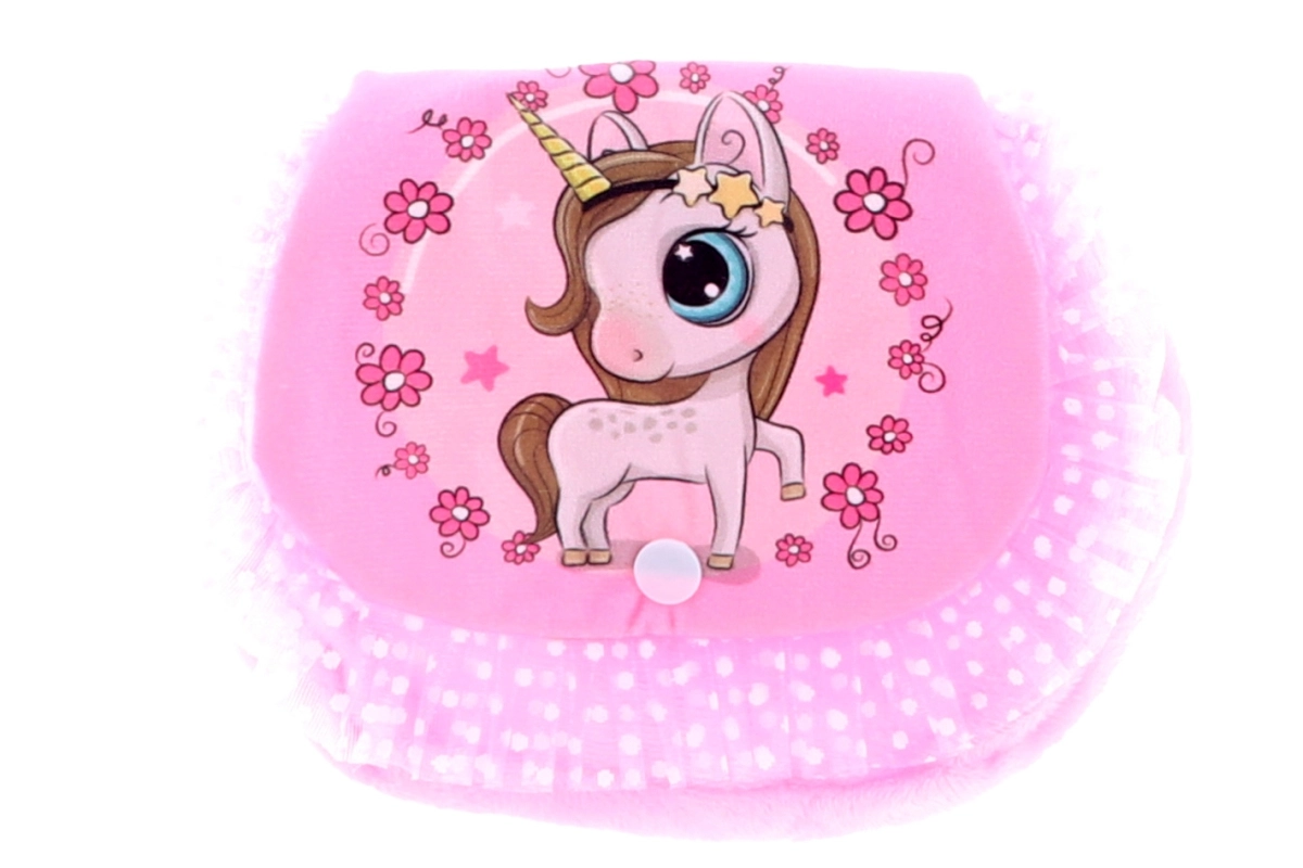 Dolce borsetta a tracolla in peluche con motivo unicorno, ideale per piccoli oggetti da portare ogni giorno. Ha una tracolla regolabile fino a 2×50 cm, una pratica chiusura con zip e dimensioni compatte 19 × 15 × 2 cm. Leggera, morbida e comoda da indossare.