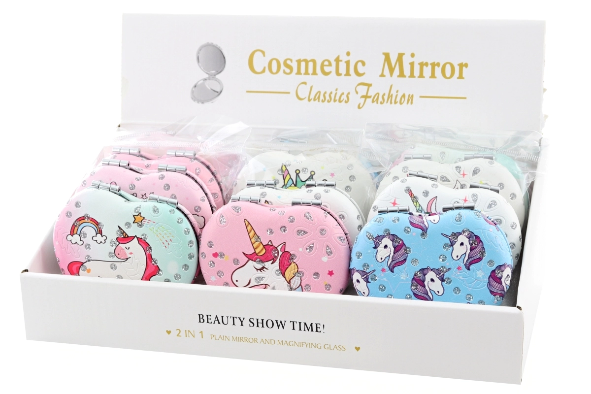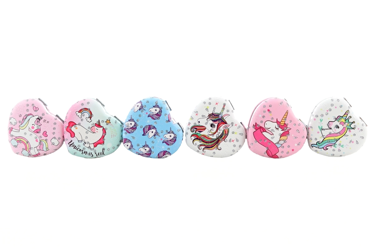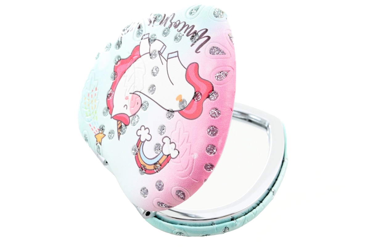 Elegante specchietto tascabile a forma di cuore con delicato motivo unicorno, perfetto per l’uso quotidiano. Grazie alle dimensioni compatte di circa 7 × 7 cm entra facilmente in borsa o nello zaino. Leggero, salvaspazio e dal design adorabile, è l’accessorio ideale per i viaggi e per il lavoro. Vari design disponibili – spediamo in base alla disponibilità a magazzino.