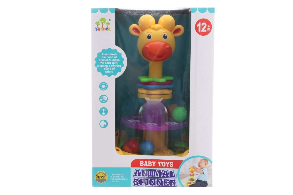 Questa allegra trottola a forma di giraffa offre ai bambini la gioia del movimento e della scoperta. Con una semplice pressione sulla testa della giraffa, gli elementi interni con palline iniziano a ruotare, creando un effetto visivo coinvolgente e motivando i bambini a giocare ripetutamente. La trottola è ideale per sviluppare la motricità fine, la coordinazione occhio–mano e la percezione dei colori.