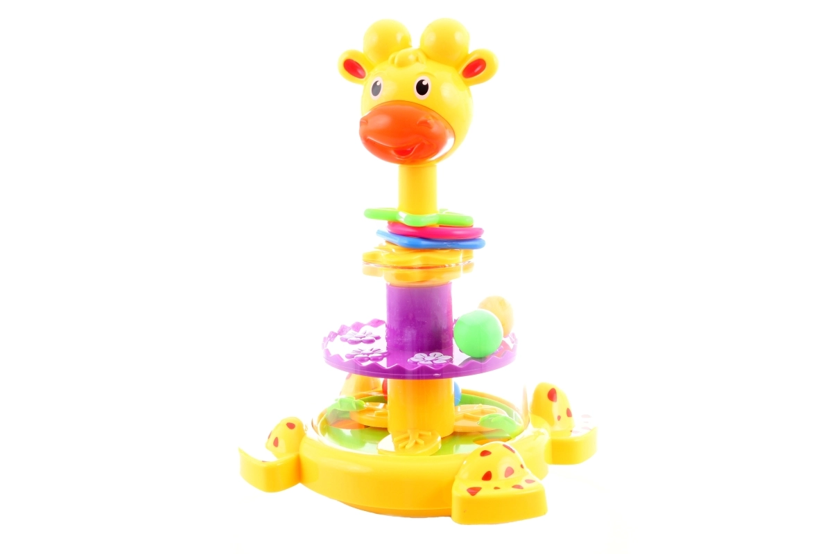 Meccanismo intuitivo: con una leggera pressione sulla testa della giraffa, le palline e gli anelli colorati all’interno della camera trasparente iniziano a ruotare.