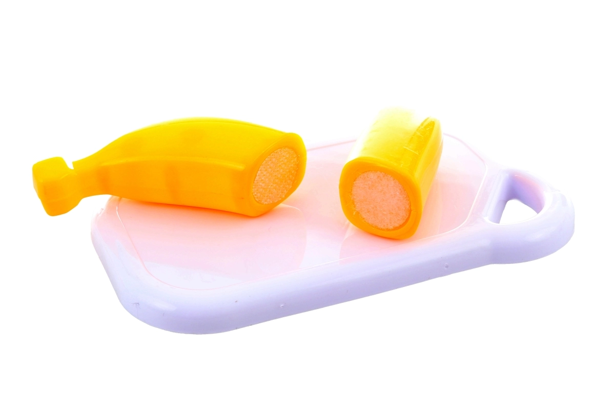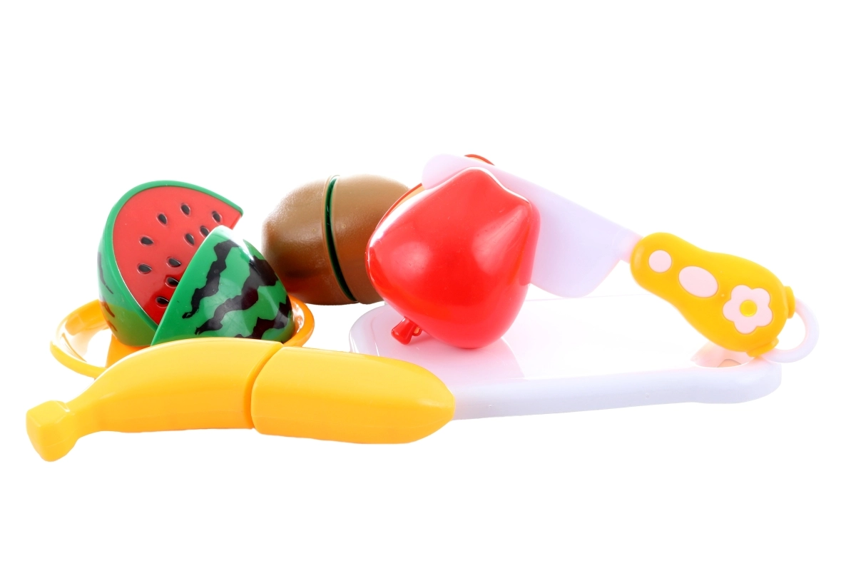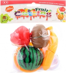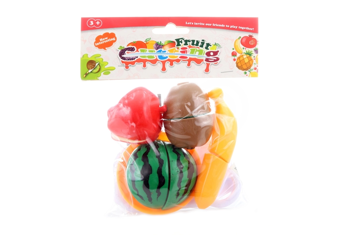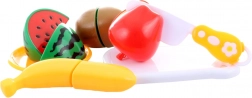 La confezione include quattro tipi di frutta (mela, kiwi, banana, anguria), tagliere, coltellino e piattino. Il materiale leggero, i bordi arrotondati e la costruzione resistente rendono il set un accessorio perfetto per la cucina dei bambini e per il gioco al negozio.