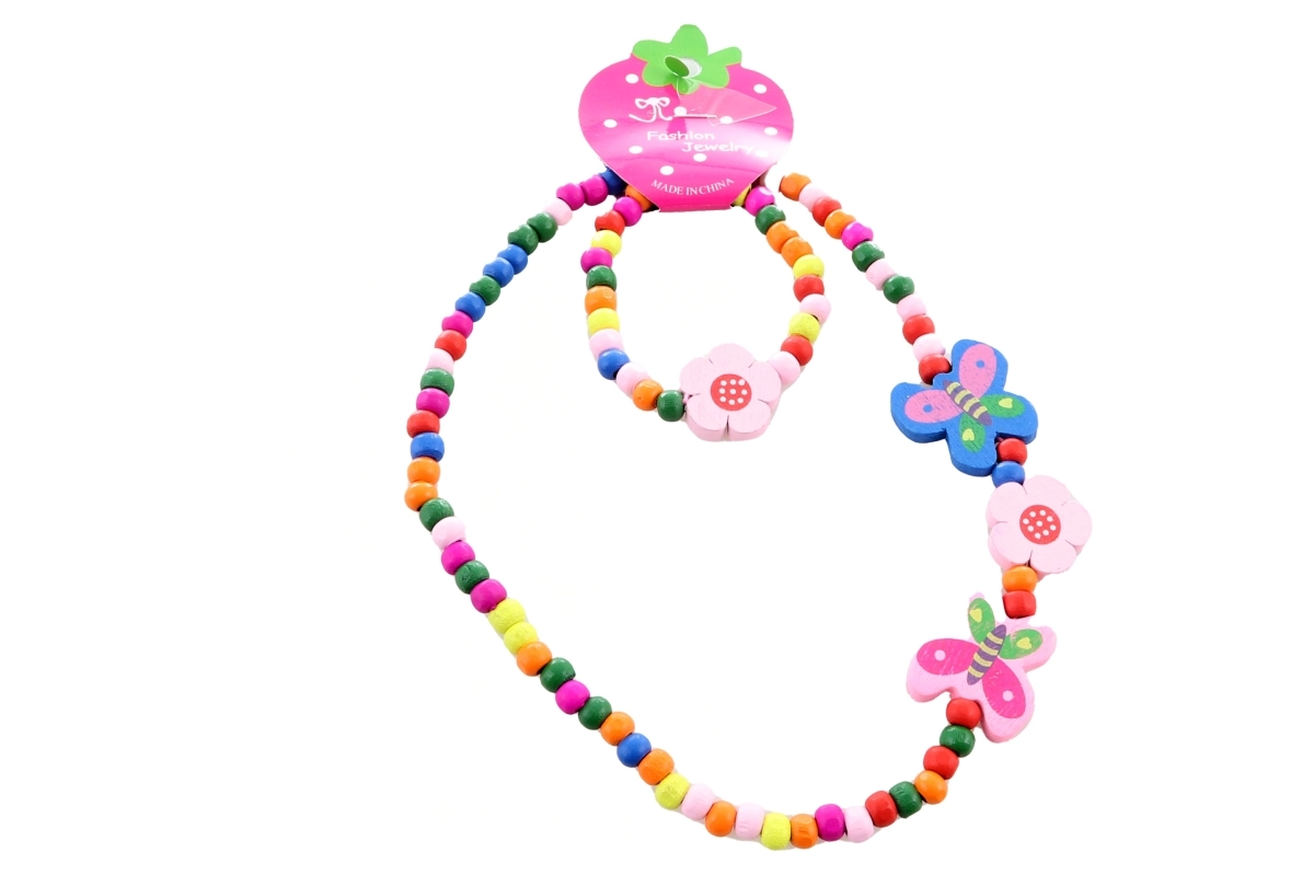 Delizioso set di accessori per piccole amanti dello stile con motivo a farfalle. Include una collana e un bracciale in perline di legno, infilati su un elastico per un indosso comodo e adattabile. Un ottimo complemento ai look dei bambini, confezionato in una pratica bustina.