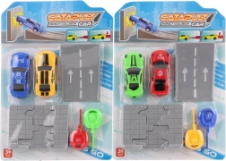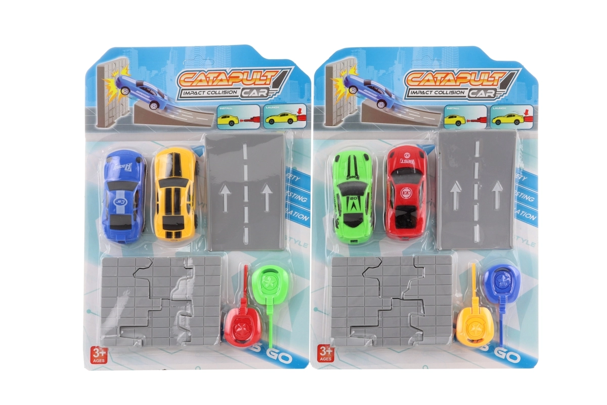 2 macchinine, piattaforma, muro da sfondare, 2 lanciatori