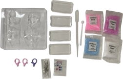 - Sabbia, stampino, cucchiaino, contagocce, gemme autoadesive, moschettoni, anellini, spilli metallici, catena a palline, contenitori