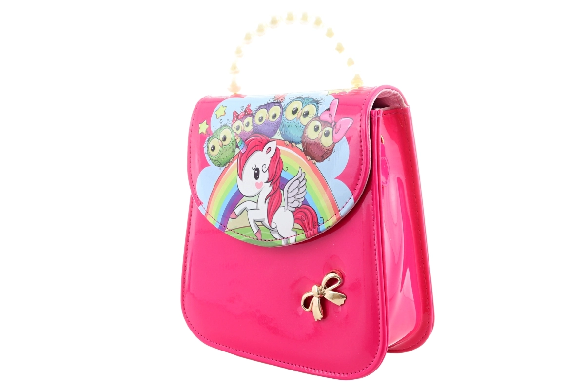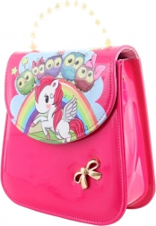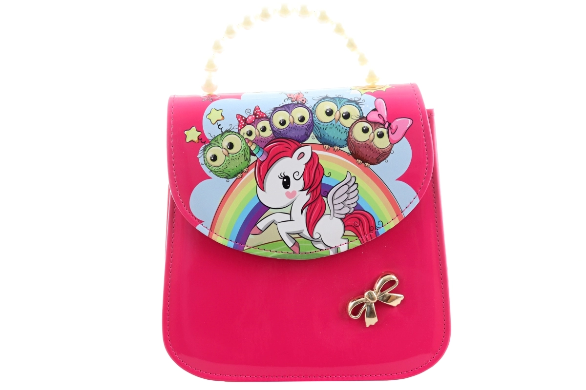 Questa elegante borsetta rosa con stampa colorata di unicorno, arcobaleno, stelline e gufetti è pensata per i bambini che amano un design giocoso e desiderano tenere i propri tesori a portata di mano. La superficie lucida è facile da mantenere e ha un aspetto elegante.