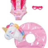 Regala alla tua BABY born 43 cm una giornata di stile in acqua. Il costume con magico motivo unicorno e maniche con volant dona un aspetto delicato, mentre la ciambella gonfiabile a forma di unicorno assicura tanto divertimento in piscina e nella vasca da bagno. Gli occhiali da sole a cuore e i graziosi sandaletti completano il perfetto outfit estivo.