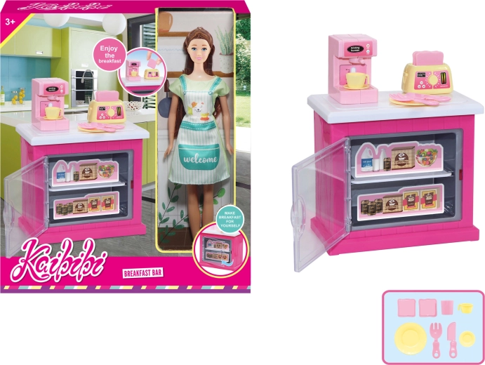 La confezione include un elegante mobile da cucina, accessori funzionali come la macchina da caffè e il tostapane e altri utensili da cucina, con i quali i bambini possono facilmente preparare un “caffettino” e croccanti toast per i loro ospiti.